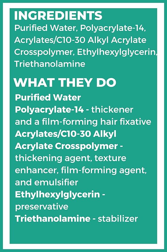 - Hydrates, Conditions & Styles - One of the key ingredients in our gel is Polyacrylate-14 that helps control frizz, helps define long lasting curls and maintain your style with medium hold