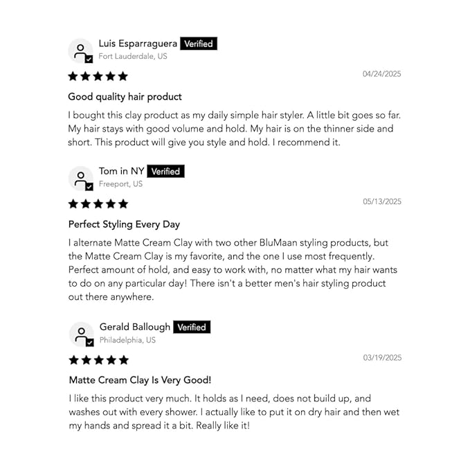 - SMOOTH APPLICATION WITHOUT TUGGING OR PULLING: BLUMAAN’S Matte Cream Clay is set to become your staple hair product. It’s effortless to use and has minimal tugging/pulling. It’s easy to wash out too!