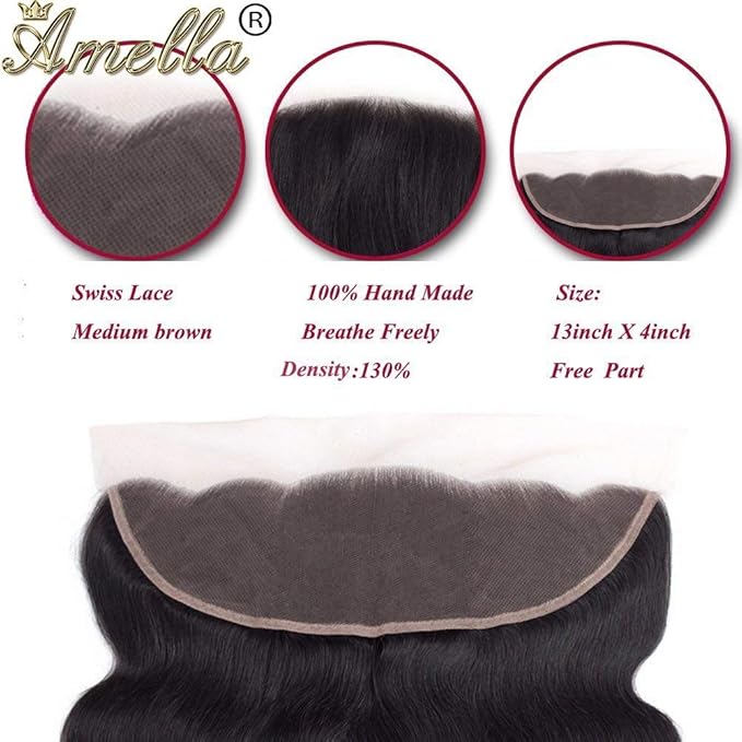 Amella Hair 3 Bundles with Frontal, 100% Unprocessed Brazilian Remy Human Hair, Body Wave, 20 22 24+18inch, Natural Black Color