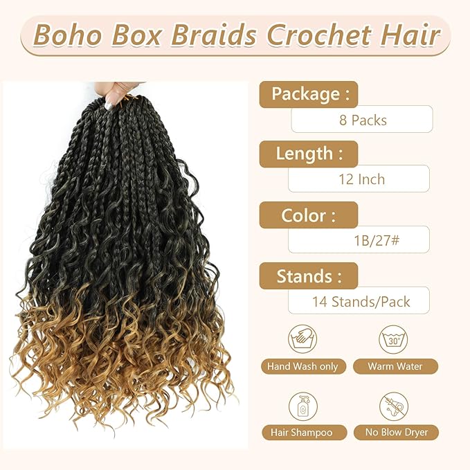 - 【Goddess box braids Crochet hair Package】--8 Packs 14inch boho box braids crochet hair pre looped , 14 roots/pack crochet braids with curly ends, 60g/Pack Crochet box Braids crochet Hair.