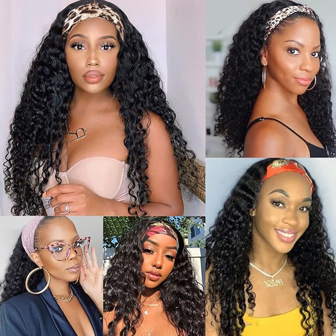 - 100% Brazilian Virgin Human Hair Headband Wigs deep wave,No Glue,No Sew In,Non Lace Front Wigs Machine Made Headband Wigs For Black Women.No Tangle,No Shedding,No Smell,Soft, Healthy,Can Be Straightened,Curled,Bleached,Dyed,And Styled As Your Own Hair