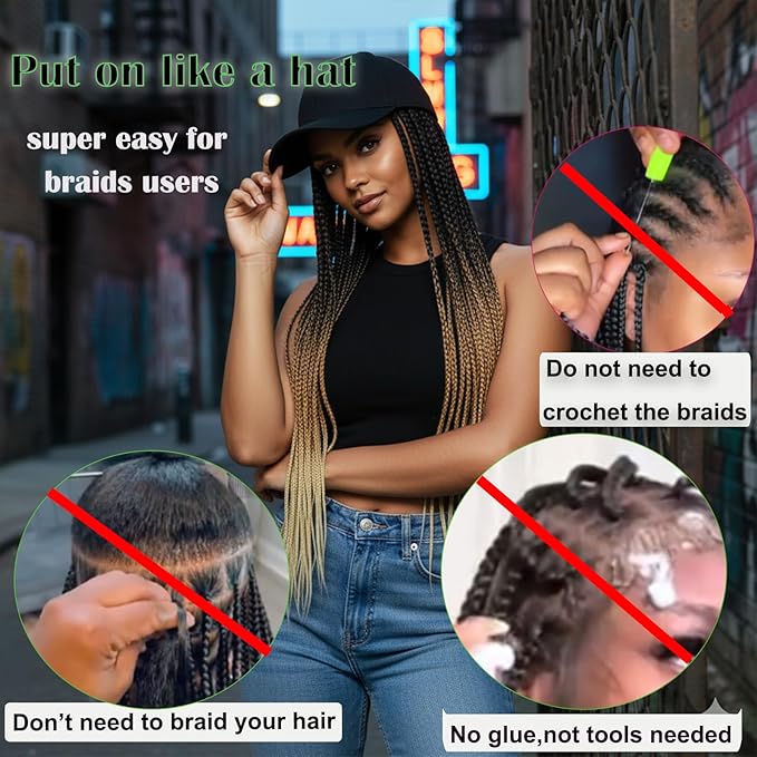 - Baseball cap wig material:the braid hat wig is made of box braided hair extensions which is high temperature synthetic fiber and baseball cap,tangle free,shedding free.