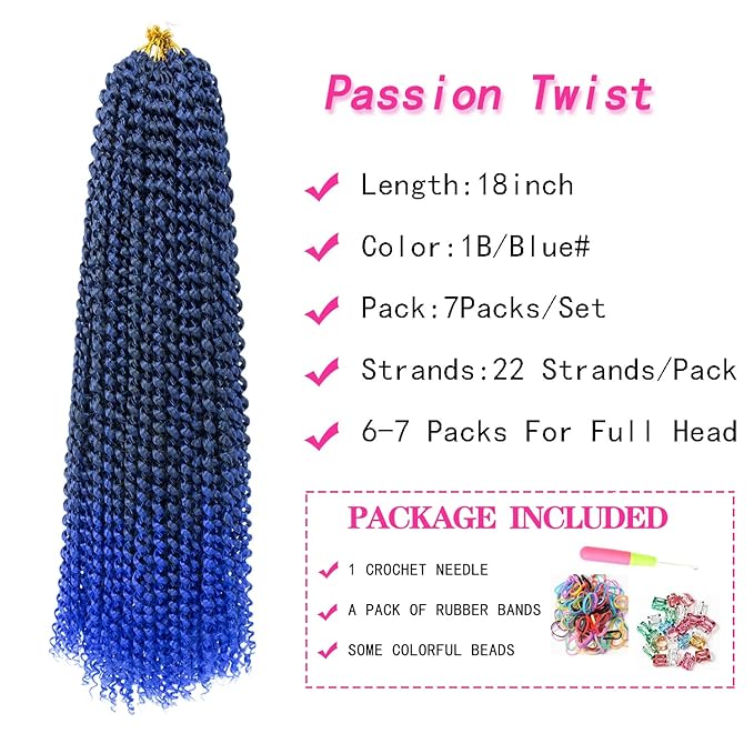 - Passion Twist Braiding Hair Specification:22 strands/pack,three package(2 Packs/lot,6 Packs/lot and 7 Packs/lot) . Usually 6-7 Packs Are Enough To Full A Head.Additional include:1 crochet needle, a pack of rubber bands, and some cute hair jewelry.