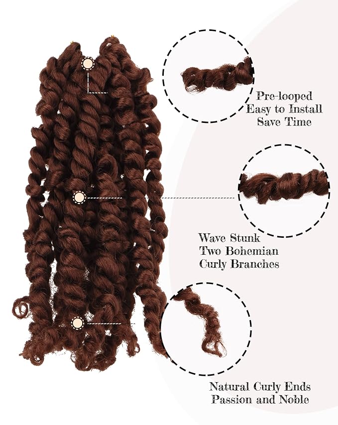 - 1.Fasion Style:Youngluchi Pre-twisted Passion Twist Crochet Hair Is Made Of Spring Kinky Twist Bohemian Curls With High Quality Flame-retardant Hot Water Setting Low Temperature Synthetic Fiber.
