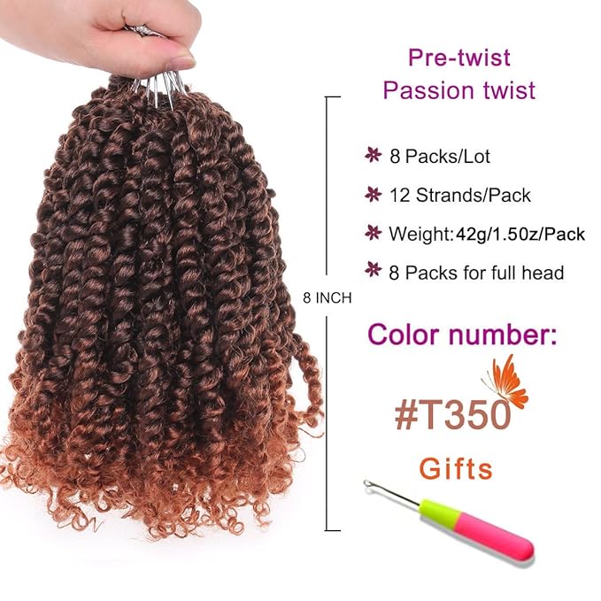 - 1:8 Inch 8 packs Short Bob Pre-twisted Passion Twist Crochet Braiding Hair Made By Professional Braider,the Short Passion Twists Hair is already twisted,it is beginner friendly,it is good choice to Save Time and Save Money.