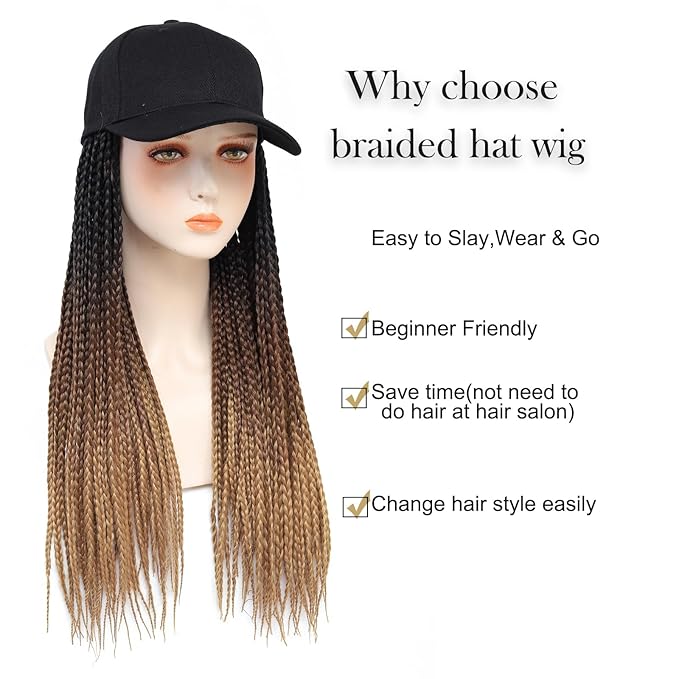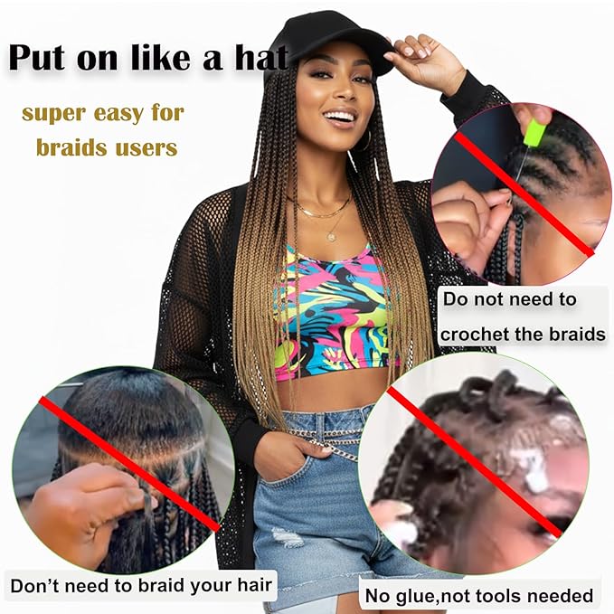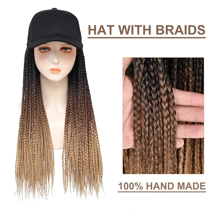 Hat Wig for Women Baseball Cap with Braided Hair Attached Synthetic Knotless Box Braid Wig Hat Adjustable Cap with 18in long ombre black brown light brown Braids for Daily Outdoor Use