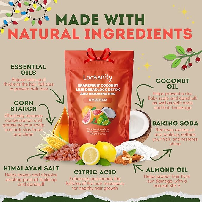 - High-Quality, Plant-Based Ingredients - Our detoxifying dreadlock powder is made of baking soda, citric acid, himalayan salt, coconut and almond oils, and a blend of essential oils. No parabens, mineral oil, or phthalates – just honest, natural hair care for your dreadlocks.