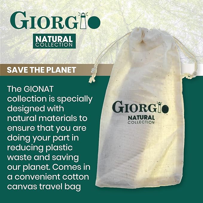 - GIORGIO NATURALS - The GIONAT collection is specially designed with natural materials to ensure that you are doing your part in reducing plastic waste and saving our planet. GIONAT products come in a convenient cotton canvas travel bag for storage