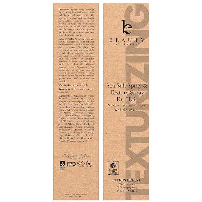 - MADE IN USA FROM NATURAL INGREDIENTS: ๐๐ซ๐จ๐ฎ๐๐ฅ๐ฒ ๐ฆ๐๐๐ ๐ข๐ง ๐ญ๐ก๐ ๐๐๐, our sea salt spray for hair is formulated from natural and organic ingredients. Enhanced with organic aloe vera, our texture spray for hair ensures waves without drying or brittleness, leaving even dyed hair feeling soft and natural.