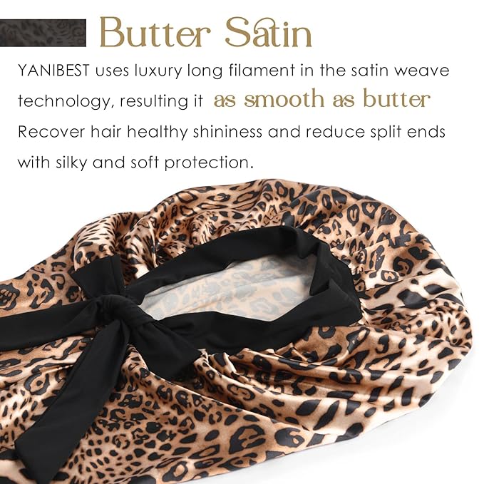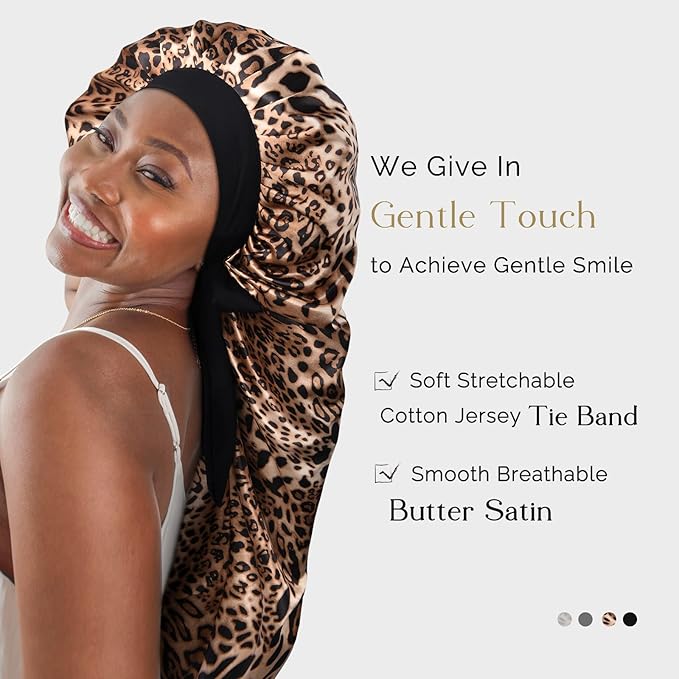 2 Pcs Hair Bonnets for Women Satin, Black Leopard Soft Elastic Band Long Satin Bonnet Sleeping Cap for Women Bonnet for Braids