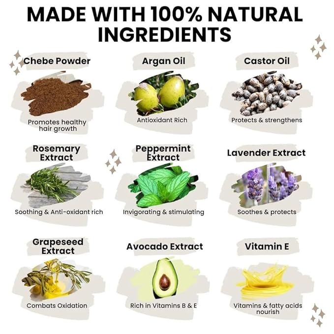 - Active Ingredients : African Chebe Powder, Peppermint Essential Oil, Rosemary Essential Oil
