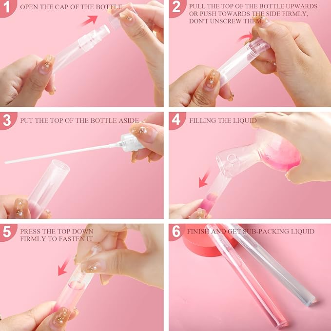 - Package Included: 10pcs 10ml (0.34oz) mini clear plastic spray bottle empty. Note: In order to open the top of the bottle, just pull them upwards or push towards the side and then they will pop off. Don't need unscrew them.