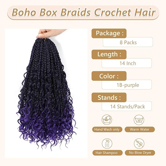 14Inch Crochet Box Braids Hair -8 Packs Goddess Box Braids Crochet Hair Bohemian Curly Crochet Hair Pre-looped Crochet Hair for Black Women(1B/Purple)