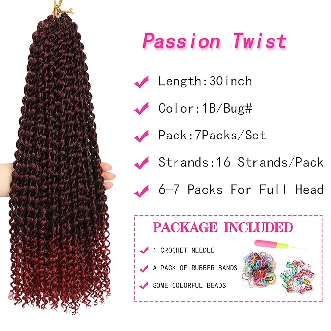 - Passion Twist Braiding Hair Specification:22 strands/pack,three package(2 Packs/lot,6 Packs/lot and 7 Packs/lot) . Usually 6-7 Packs Are Enough To Full A Head.Additional include:1 crochet needle, a pack of rubber bands, and some cute hair jewelry.