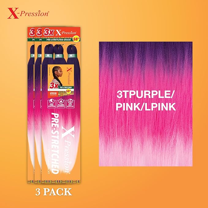 Sensationnel X-pression prestretched braiding hair - 3x braid 58 inch all kanekalon flame retardant synthetic braid for box braids and twists (3 pack, 3TPURPLE/PINK/LPINK)