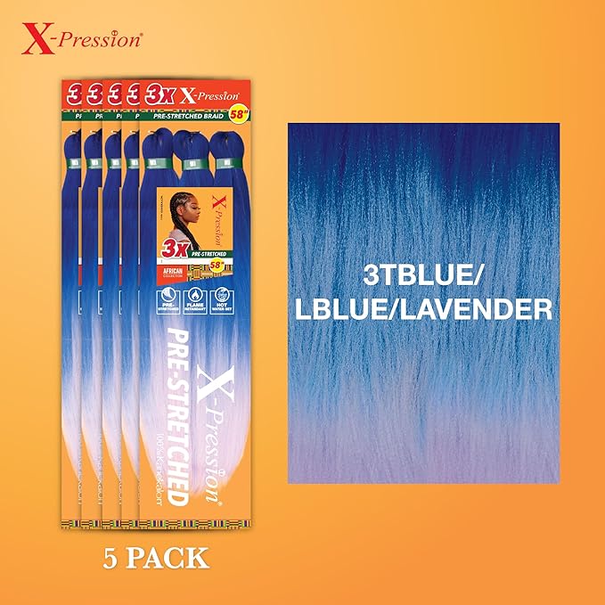 Sensationnel X-pression prestretched braiding hair - 3x braid 58 inch all kanekalon flame retardant synthetic braid for box braids and twists (5 pack, 3TBLUE/LBLUE/LAVENDER)