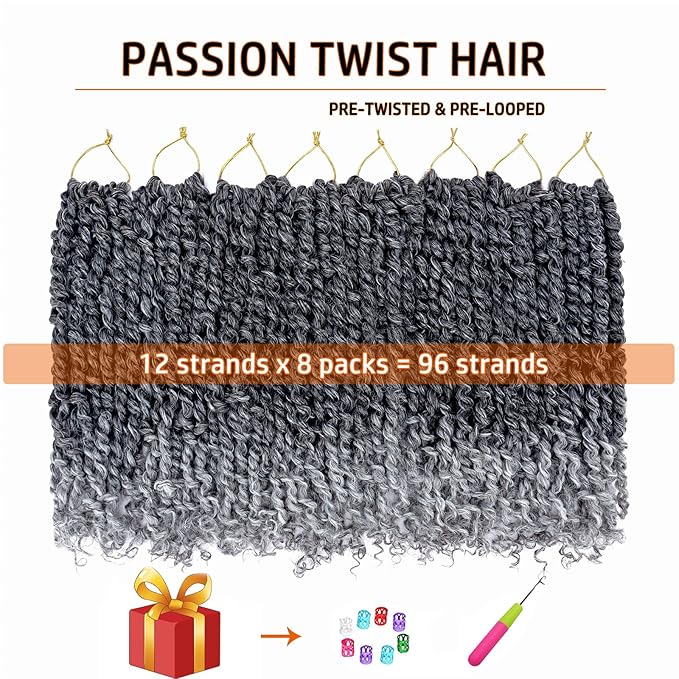 - [Prelooped Crochet Braids Size & Color] Passion twist crochet hair has 7 Colors: 1B, T27, T30, T350, Tbug, Tgray, and 1B/30/27. And 6 sizes available: 6/8/10/12/14/18inch. 8packs/lot, 12strands/pack, 96strands totally, enough for a full head.