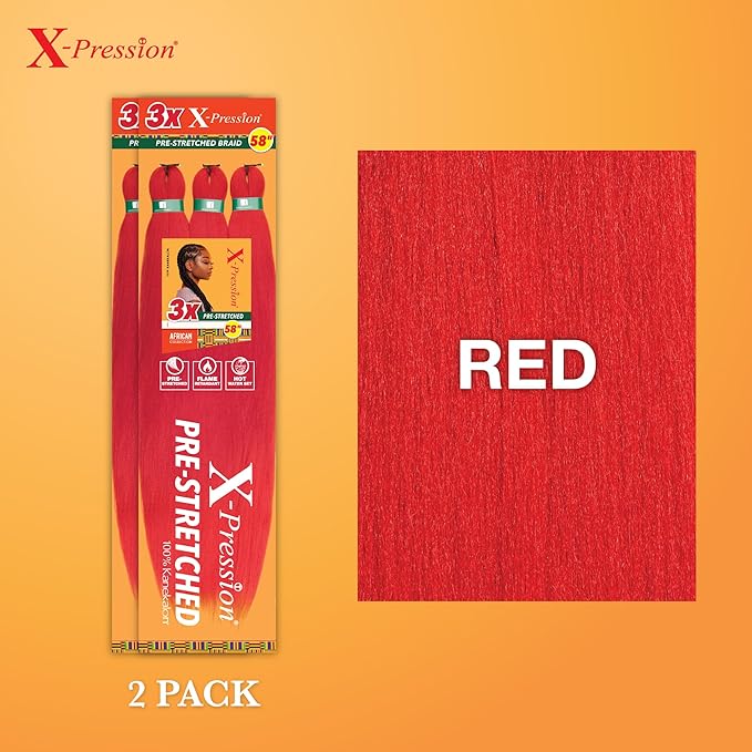 Sensationnel X-pression prestretched braiding hair - 3x braid 58 inch all kanekalon flame retardant synthetic braid for box braids and twists (2 pack, RED)
