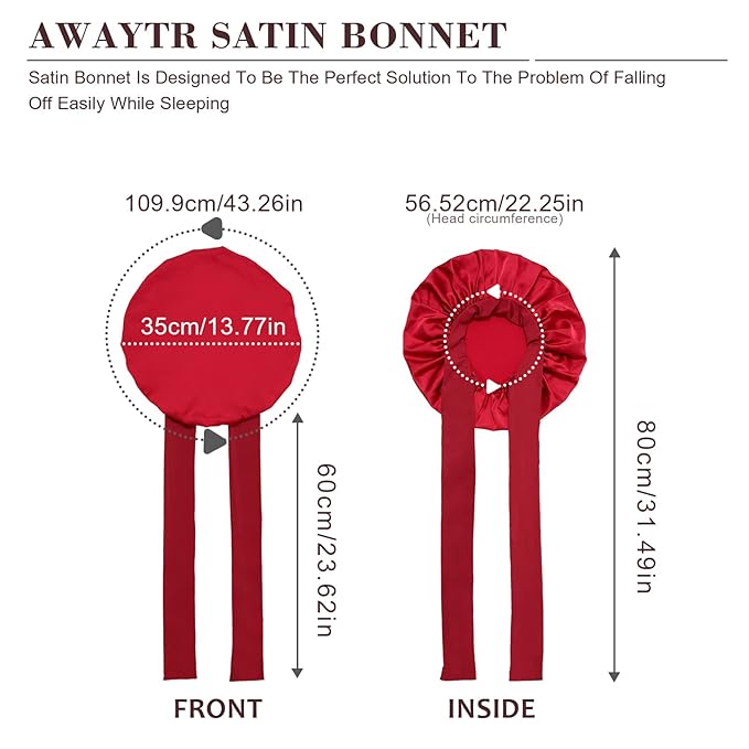 - SATIN BONNET WITH TIE BAND - Our satin bonnet is designed to be the perfect solution to the problem of falling off easily while sleeping. The bonnet comes with straps that you can adjust according to the size of your head circumference and fits most women and girls, even if you are an active sleeper you can fix it in the right position.