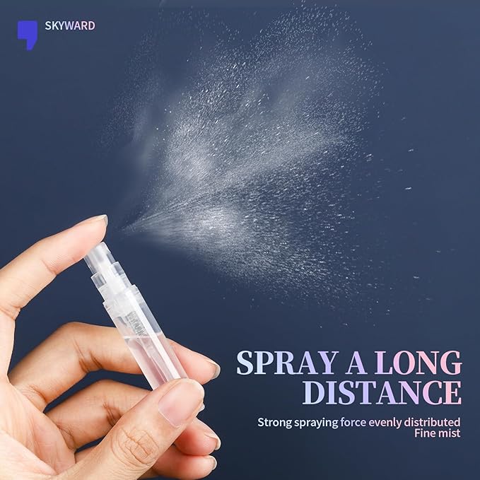 - Fine Mist Effect: Designed with high quality nozzle, will not clogged up nor gets stuck easily. The spring is long enough, which is convenient for pressing out liquid and the spring-loaded button ensures sufficient liquid to be sprayed, fine mist and evenly distributed. Mini plastic perfume atomizer has a strong spraying force and can spray a long distance.