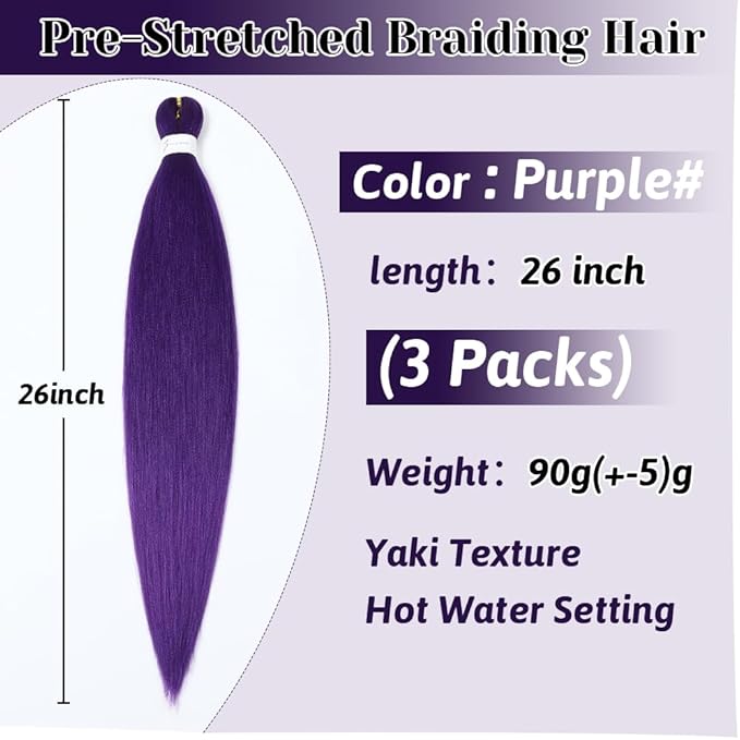 Purple Braiding Hair Extensions 26 Inch Pre stretched Braiding Hair Hot Water Setting Synthetic Hair Colored Braiding Hair Pre Stretched Crochet Braids Hair(26 Inch,3 Packs,Purple#)