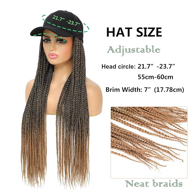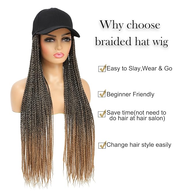 Hat Wig for Women Baseball Cap with Braided Hair Attached Synthetic Box Braid Wig Hat Adjustable Cap with ombre light brown Braids for Daily Outdoor Use(BL-T27)