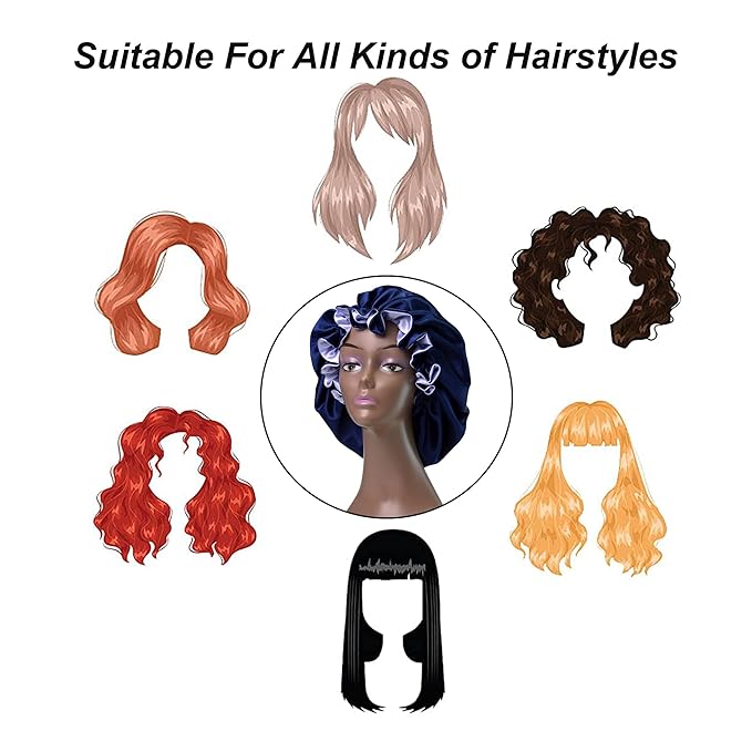 - 【Double Layer Design】:Satin bonnet has double-layer design can not only increase the beauty, but also improve the ability to bear more hair, even if you use an over night hair mask or oil it will not stain you pillows and sheets when sleeping.You can flip the hat to change the color, the size can be adjusted, it is large and flexible enough.