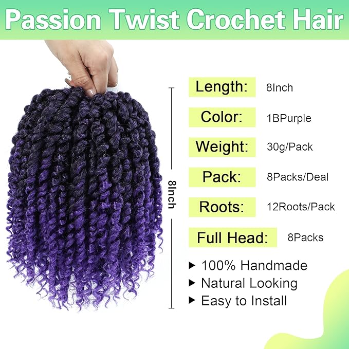 Passion Twist Hair 8 Packs Passion Twist Crochet Hair 8 Inch Pre Looped Crochet Hair For Black Women Short Crochet Passion Twist Braiding Hair Extensions TPurple#โฆ