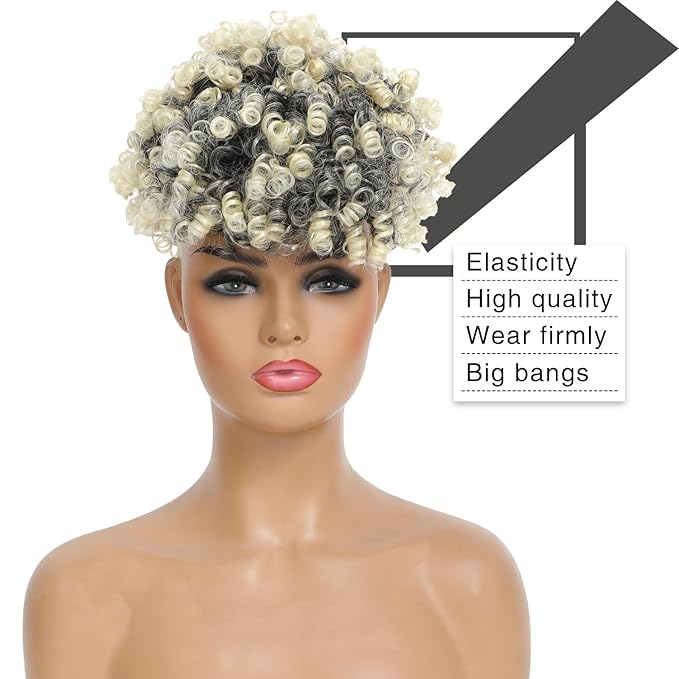 ENTRANCED STYLES Drawstring Ponytail with Bangs - Afro Puff Extensions for Women, Short Curly Clip in Wrap Updo Hairpiece (T1B/613#)