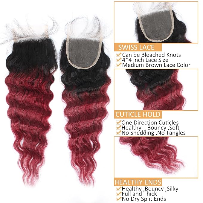 Loose Wave Bundles With Closure Burgundy Color Human Hair Loose Deep Wave Brazilian Virgin Hair 3 Bundles With 4x4 Lace Closure 1B99j Ombre Human Hair Bundles 70g/Bundle (24 26 28+22)