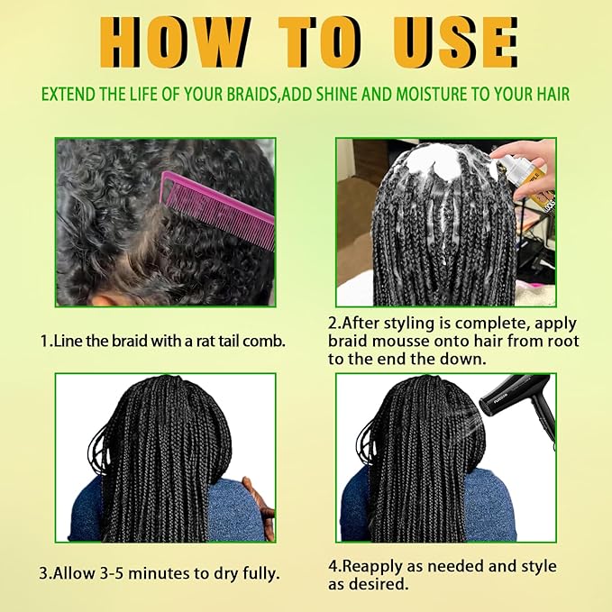 - Long-lasting Hold: Hair mousse for braid is the perfect finishing touch to all your protective hairstyles because it holds and seals your braids in place and makes them long last. It locks in moisture and helps you keep your hairstyle longer.