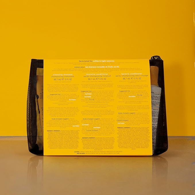 - For travel or trial, includes 3 oz Leave-In Conditioner, 3 oz. Intensive Conditioner & 3 oz. Cleansing Shampoo plus comes in a chic mesh bag