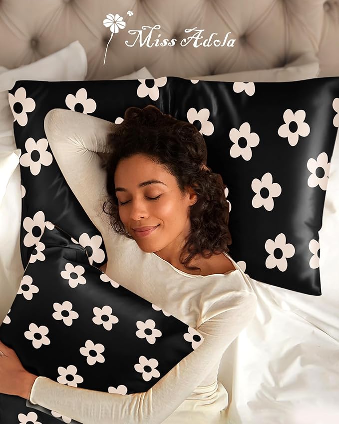 Silk Pillowcase 2 Pack - Cute Pillow Cases 20" x 26" Standard Size Set of 2 for Hair and Skin Smooth Soft Breathable with Hidden Zipper Cooling Pillow Covers for Sleeping, Black Flower