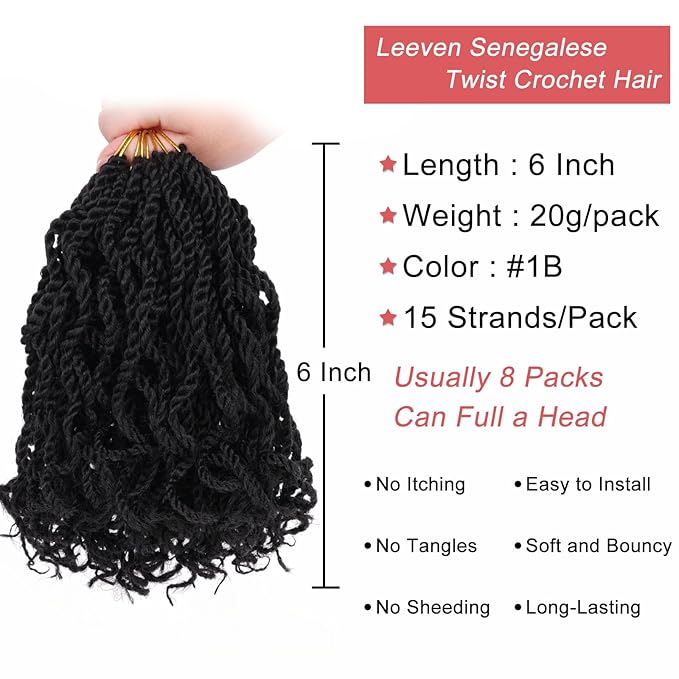 Leeven 6 Inch Senegalese Twist Crochet Hair with Curly Ends, 8 Packs Black Pre Looped 2 Strand Short Twist Hair, Wavy Small Hanava Twist, Synthetic Crochet Braids for Women Girl Kids