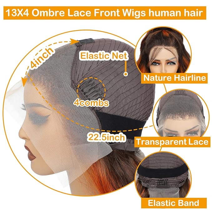 - 【13x4 Ombre Body Wave Lace Front Wigs with Medium wig cap】The lace of the highlight ombre body wave wig is 13x4 HD transparent ,thin and natural , Blends well with any skin tone. Soft and comfortable lace bring good install feeling, Stylish dispersed highlight strips effortlessly elevate your hairstyle. 22.5"(average cap), fit for most women,4 combs to fix on head, two adjustment straps can be adjusted to different head sizes, giving you a more comfortable wearing experience. breathable & durable lace material make it more comfortable.
