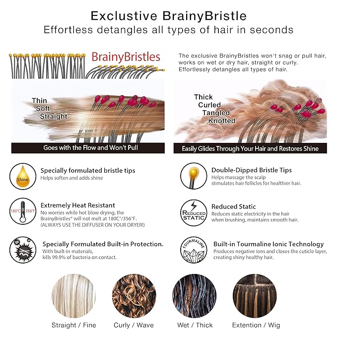 - HEAT RESISTANT BRUSH BRISTLES. Our brushes feature exclusive BrainyBristles, which are heat resistant to over 300 degrees Fahrenheit, making them the perfect addition to your styling tools. Blowdry and apply heat without worry of melting or warping.
