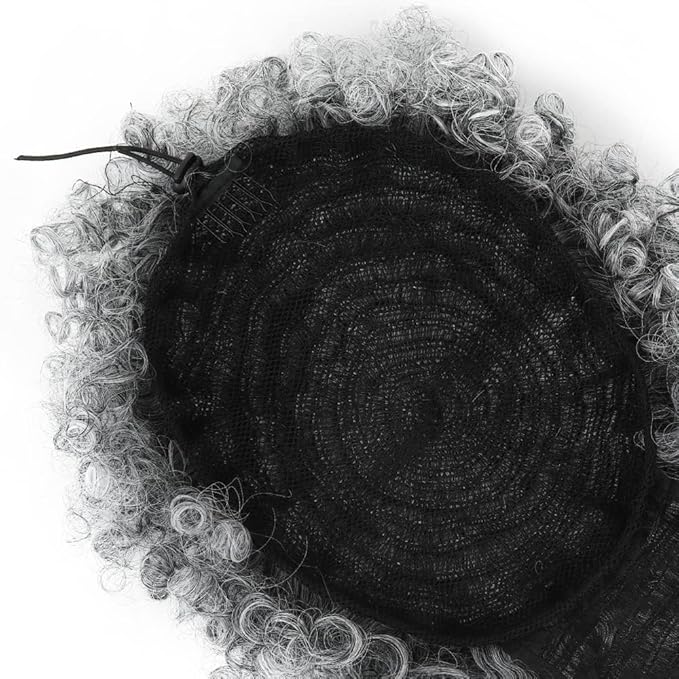- Material: High-quality heat-resistant synthetic hair piece. Product Name: Afro Puff Drawstring Ponytail with Bangs. One part is bangs, and the other is the bun. They are whole. And they all have the same curvature. Vibrant afro ponytail hair extensions are very voluminous and thick. Shake lightly for a more natural curl. The breathable stretch mesh makes it very comfortable to wear.