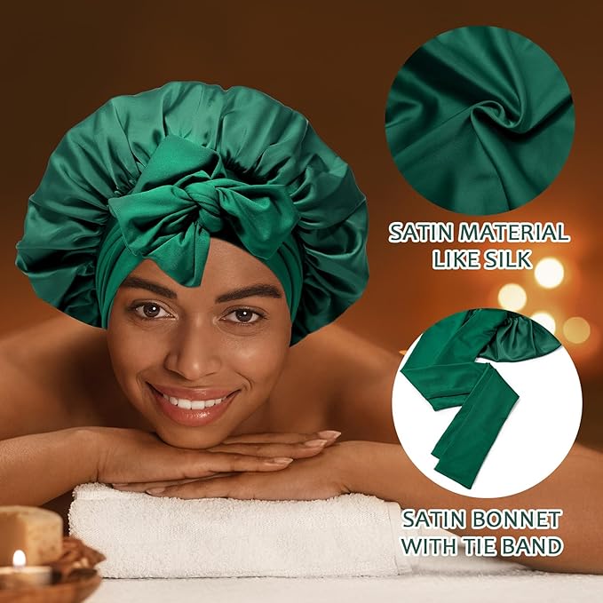 Satin Hair Bonnet with Wide Band Silk Sleeping Bonnets Hair Wrap for Women Girls Night Cap with Tie Band Satin Bonnet (Green)