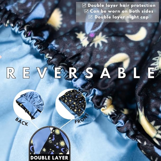 - Reversible Design for Versatile Use: Equipped with ties keeping the bonnet in place all night for maximum protection and comfort. The reversible satin bonnet for sleeping offers two elegant looks in one. Whether you need a stylish head wrap for black women or a comfortable silk hair wrap for sleeping, this bonnet adapts to your needs, providing unparalleled hair care and style. The adjustable ties ensure a secure and customizable fit.