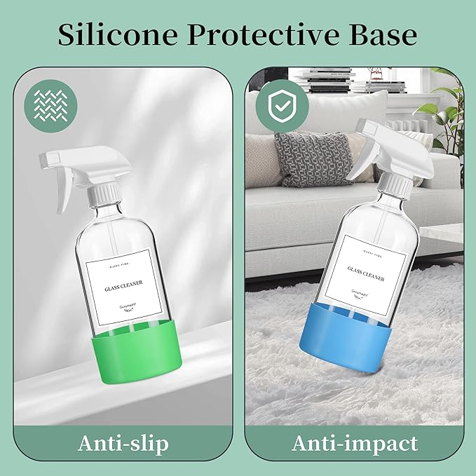 - REMOVABLE SILICONE PROTECTIVE SLEEVE :The bottom of the clear spray bottle is equipped with a silicone protective sleeve in different colors,the silicone sleeves included provide excellent grip and stability,The soft silicone is non-slip and slows the impact on the bottle,making glass bottle more sturdy,prevent slipping on countertops or tiled surfaces,effectively preventing the glass bottles from shattering and offering perfect protection