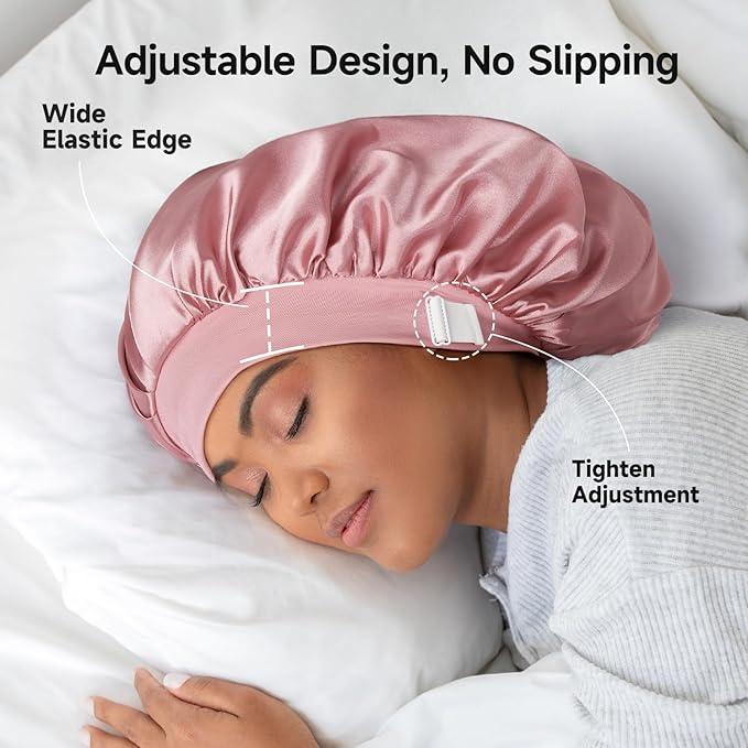 - Durable Double-Layer: Our sleeping hair bonnet combines double-layer with vibrant colors. The outer layer is crafted from premium, non-fading satin that helps lock in natural hair oils without staining your pillowcase, and the double layer fabric is more durable. Enjoy style versatility with two color options to complement your pajamas, loungewear and daily outfit