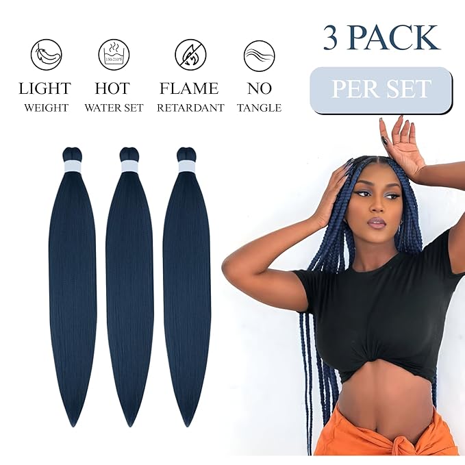 Leticia Navy Blue Braiding Hair Pre stretched Hypoallergenic Knotless Ez Braiding Hair for Braids Prestretched Synthetic Hair Extension for Women(Packs of 3,26",10 OZ)