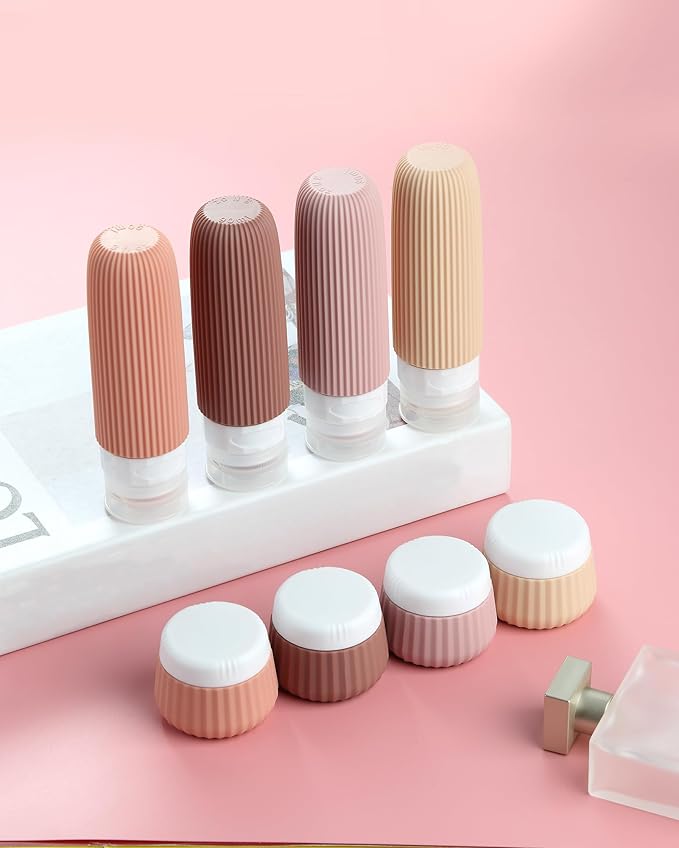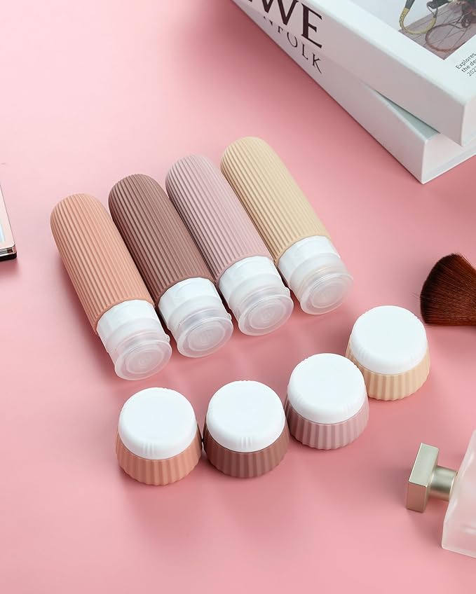 - Travel Size Toiletries: The set contains 4 pack silicone squeeze bottles and 4 pack silicone cream jars with Clear Makeup Bag.