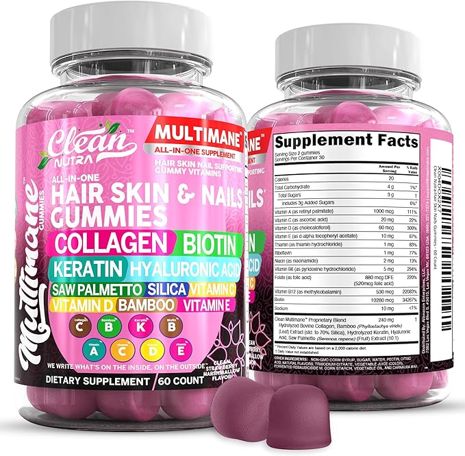 - Collagen With Biotin And Keratin Supplements: Gummy vitamins in a potent blend of powerful ingredients like collagen peptides, hyaluronic acid serum, saw palmetto extract, silica supplements, vitamin C, vitamin D3, bamboo extract, Vitamin C, vitamin d3 5000 iu, vitamin E capsules, vitamin A supplement, and folate and B12 supplement for women are formulated to support your beauty from the inside out. hair skin and nails vitamins support skin health in delicious strawberry marshmallow flavor.