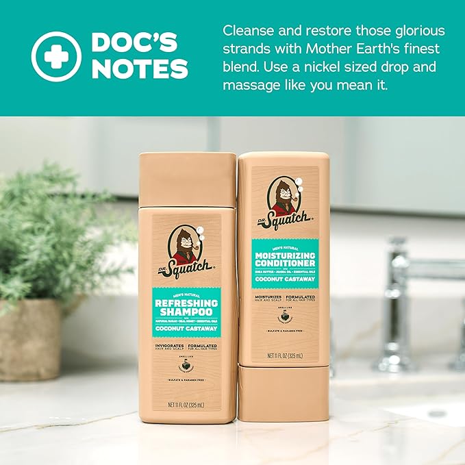 Dr. Squatch Natural Hair Bundle for Men - Healthy, Full Looking Hair - Coconut Castaway Shampoo (11 fl oz), Coconut Castaway Conditioner (11 fl oz)