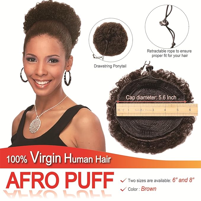 - Afro Puff Kinky Drawstring Curly Ponytail Virgin Human Hair Material: Made of 100% 12A Brazilian Virgin human hair to ensure it looks indistinguishable from real hair and lasts longer than synthetic fibers. Our Afro puff drawstring ponytail extension, soft, smooth, not shiny, natural looking, easy to attach and blends well afro puff ponytail for natural hair