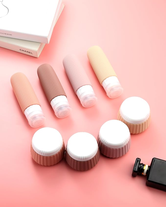 - Travel Size Toiletries: The set contains 4 pack silicone squeeze bottles and 4 pack silicone cream jars with Clear Makeup Bag.