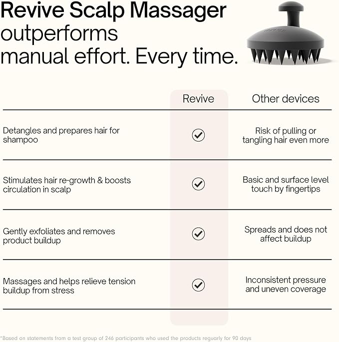 - SCALP REFRESH FOR FULLER HAIR: The revive silicone hair scrubber exfoliates gently, breaking up dandruff, buildup, and excess oil while promoting circulation. In just 60 seconds daily, this simple routine helps you prime your hair for fuller hair
