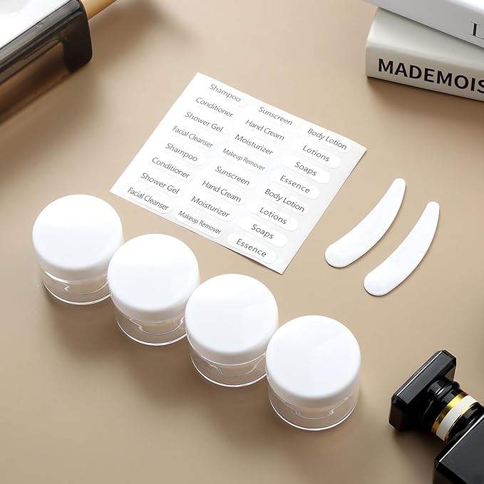 - Useful Travel Accessories: This is a nice assortment of travel containers in a useful zip case. ( Come in 4 Travel Bottles+4 Travel Jars+2 Spray Bottles+2 Scoopers+1 Funnel+1 Clean Brush + 1 Page Label + 1 Clear Toiletry Bag ) Multiple ones allow you take along different beauty products and toiletries according to your requirement
