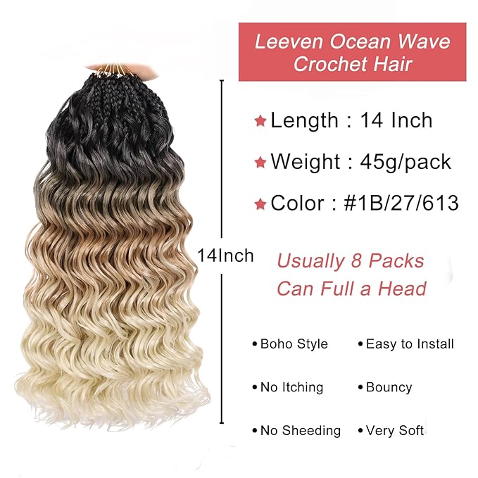 Leeven 14 Inch Pre Looped Ocean Wave Crochet Hair 8 Packs Boho Ocean Braids 3 Tone Ombre Blonde Short Curly Crochet Hair Pre Twisted Synthetic Deep Wavy Crochet Hair for Women
